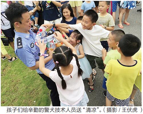 湖南省公安厅刑侦总队警犬工作支队政委刘补吾告诉孩子们:“他们是退役犬。警犬的服役期大约有7—8年,随着身体机能的下降,它们不得不退役,而这也是我们最难受的时候。但他们退役后会有专人继续精心饲养,我们也会经常牵出自己曾经的‘战友’们,一起在熟悉的训练场上散散步,说说心里话……朝夕相伴了那么多年,他们就是我们生命的一部分,我们谁都离不开谁。”