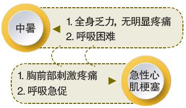“每年都有一些假中暑患者,其中不乏急性心肌梗塞病人。”张兴文介绍,部分急性心梗表现与中暑的先兆症状非常相似,尤其在炎热的高温天气。中暑与心梗都是高发疾病,两者发病早期有许多相似之处,如胸闷气短、面色苍白、大汗淋漓、乏力等。不过,急性心梗的主要症状是胸前部疼痛,同时伴有全身不适,这点可与中暑区别。