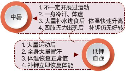 “前几天接诊的一名中暑男子送医后,只补充了一瓶含钾丰富的饮料,就生龙活虎了。”吕雄说,虽然不好区分,但判断低钾血症还是中暑只需要区分两点——有没有大量出汗、是否出现突发性软瘫(即四肢酸软无力)。