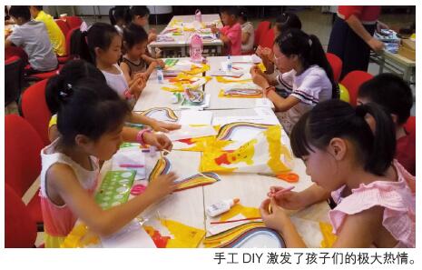 首堂体验课,市老年合唱团副团长、原太阳宫小学副校长颜俊为孩子们带来“合唱哆来咪”。呼气,吸气,咪咪咪,嘛嘛嘛……孩子们跟着颜俊开嗓、练声,体验营里回荡着纯净、清透的天籁之音。此外,市女性手工艺品协会的颜婷带来了手工DIY,手把手教孩子们制作衍纸书签。衍纸是纸艺的一种形式,也称卷纸,发源于18世纪的英国。它是以专用的工具将细长的纸条一圈圈卷起来,成为一个个小“零件”,然后借此组合成样式复杂、形状各异的艺术作品。