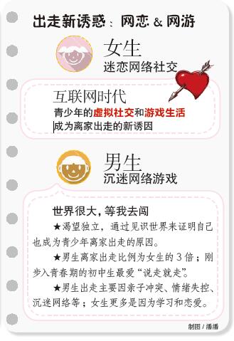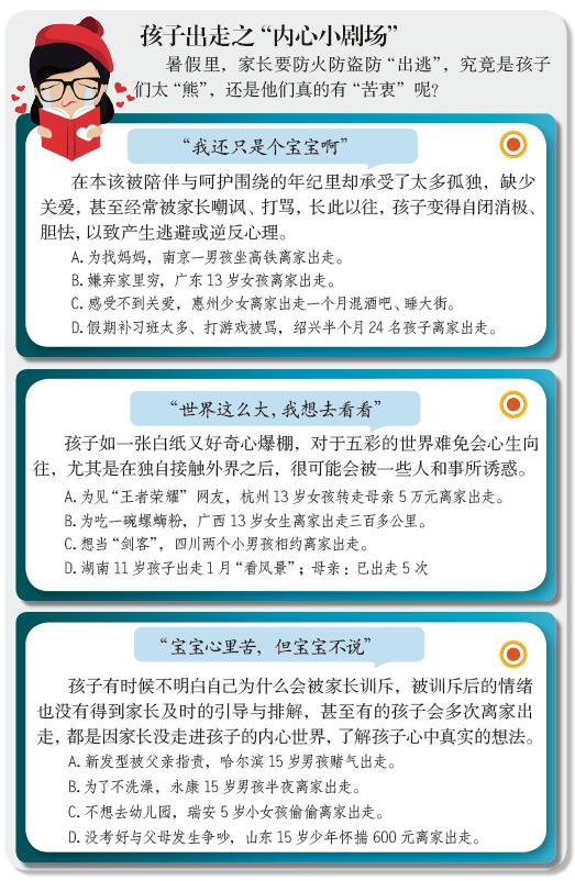 首先,有逃避心理,以逃学最为常见。孩子缺乏对学习的动力与欲望、经受不住家长和老师的批评指责;其次,人际关系难处理,家庭关系、师生关系以及同学关系紧张都是导致出走的原因,而亲子关系恶劣对孩子的伤害很大。最后,有效仿行为,以留守孩子为主。如今孩子了解外界信息的渠道很多,好奇心更重,尤其是农村的孩子——外面世界的诱惑、追寻务工父母的脚步等都是促使他们“说走就走”的理由。