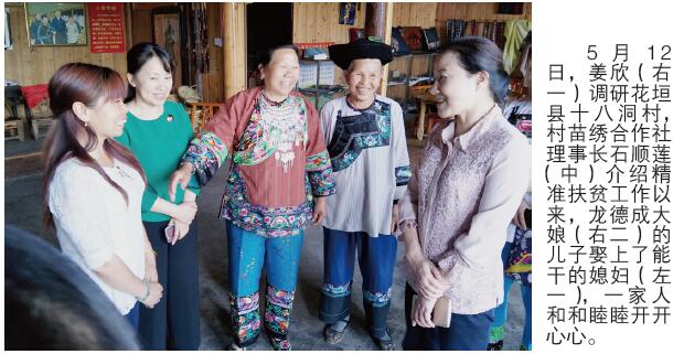 5月12日,我们在湘西自治州调研,座谈会就放在十八洞村。在老村支书石顺莲家的院坝里,十多个苗家妇女正飞针走线。石顺莲拿来社员们精心绣制的苗族传统服饰给我看,花红叶绿的底子上,绣娘们精心绣上了喜鹊报喜的吉祥图案,针脚细密,绣技高超。除了传统产品,合作社还生产抱枕、电脑包、ipad包、围巾等年轻人喜欢的绣品。谈及合作社的发展,石顺莲充满信心:“我们将尽力提升质量、争取订单,让‘巾帼巧手创业就业孵化基地’的牌子亮起来。”