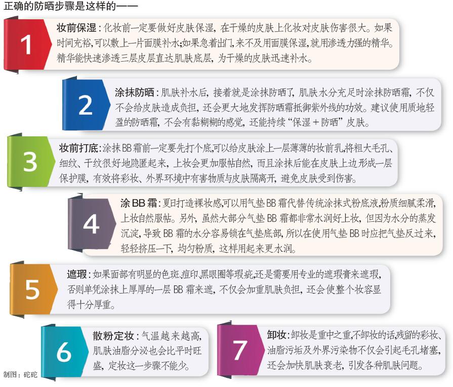 “每年夏季,门诊皮肤病患者中都有近三分之一的人因为使用不适合的防晒品引发疾病,并以皮肤过敏症状为最多,少数人面部会出现红肿等症状。”该院皮肤科主任田立红介绍,除此之外,像黄婷婷这样因为涂抹方式不对,导致防晒“失效”的情况也时有发生。所以,大家在使用防晒产品时,一方面要注意产品质量,另一方面还要注意使用步骤。