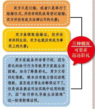 根据《最高人民法院关于适用<中华人民共和国婚姻法>若干问题的解释(二)》第10条规定,当事人请求返还按照习俗给付的彩礼的,如果查明属于以下情形,人民法院应当予以支持:1、双方未办理结婚登记手续的;2、双方办理结婚登记手续但确未共同生活的;3、婚前给付并导致给付人生活困难的。
