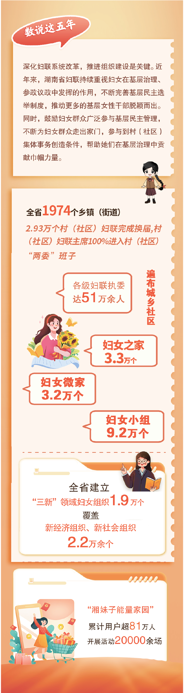2021年3月底,湖南省村(社区)“两委”换届和村(社区)妇联换届全面完成,在全省95.94%的村(社区)实现书记、主任“一肩挑”,村(社区)主职数整体缩减近一半的情况下,女性主职比例不降反升,实现女村党组织书记、女村委会主任双双超10%的目标。
