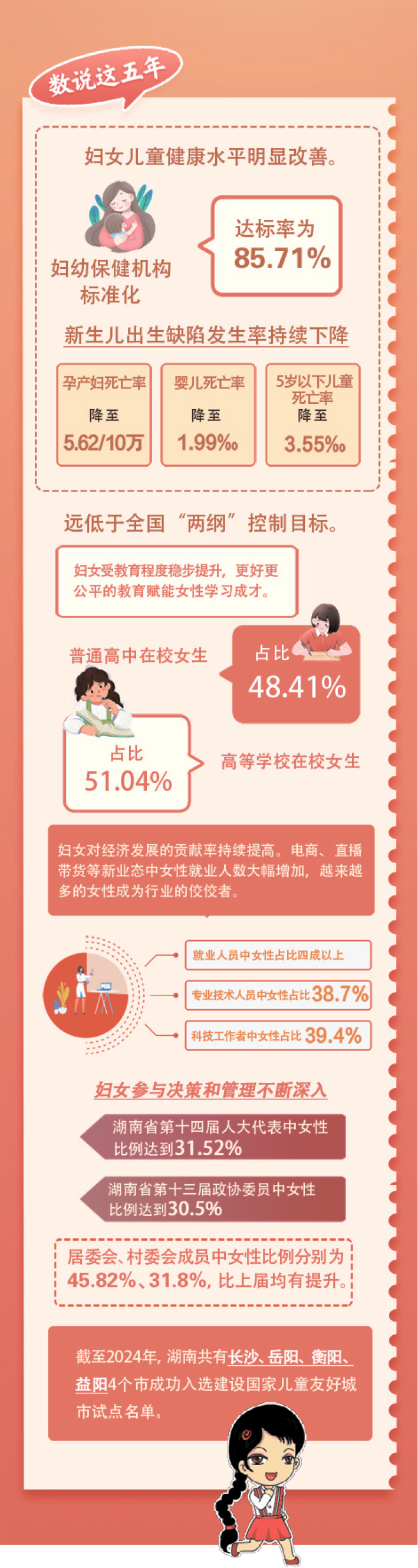 2021年9月,《湖南省妇女儿童发展规划(2021—2025年)》正式发布。与上轮规划相比,新规划增加了“妇女与家庭建设”“儿童与安全”“儿童与家庭”三个领域,充实完善了支持家庭生育、养育、教育的政策措施等,既充分体现了时代特点,又积极回应了妇女儿童新期盼。