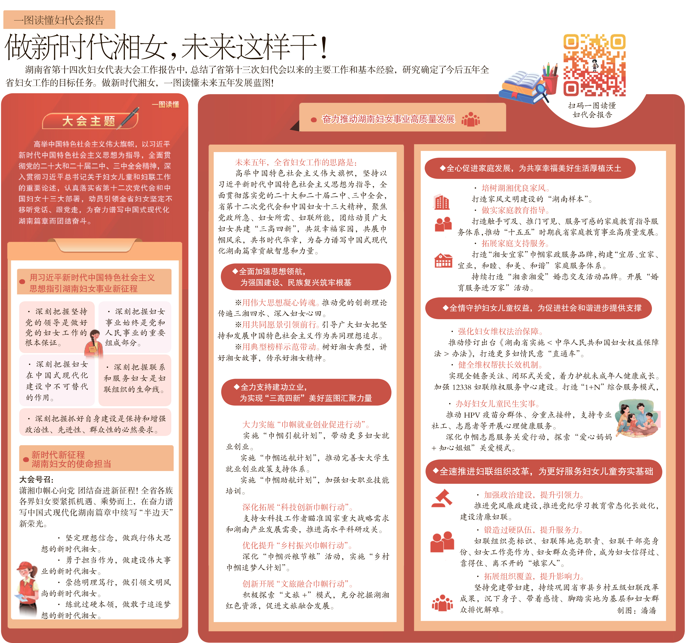 杨兰英表示,省委、省政府、全国妇联对大会高度重视,对湖南妇联工作高度肯定,对今后的妇女事业发展提出了高远期待。沈晓明书记和张晓兰副主席的讲话,为湖南更高质量推进妇女事业提供了明确的指向和精准的指导,我们要结合湖南“三高四新”美好蓝图去思考和体悟妇女事业的发展,要围绕党政所急、妇女所需、妇联所能,把握引领服务联系的切入点、着力点,深入实施巾帼就业创业促进行动、科技创新巾帼行动、乡村振兴巾帼行动、文旅融合巾帼行动,和广大妇女一起,共同谱写中国式现代化建设新篇章。