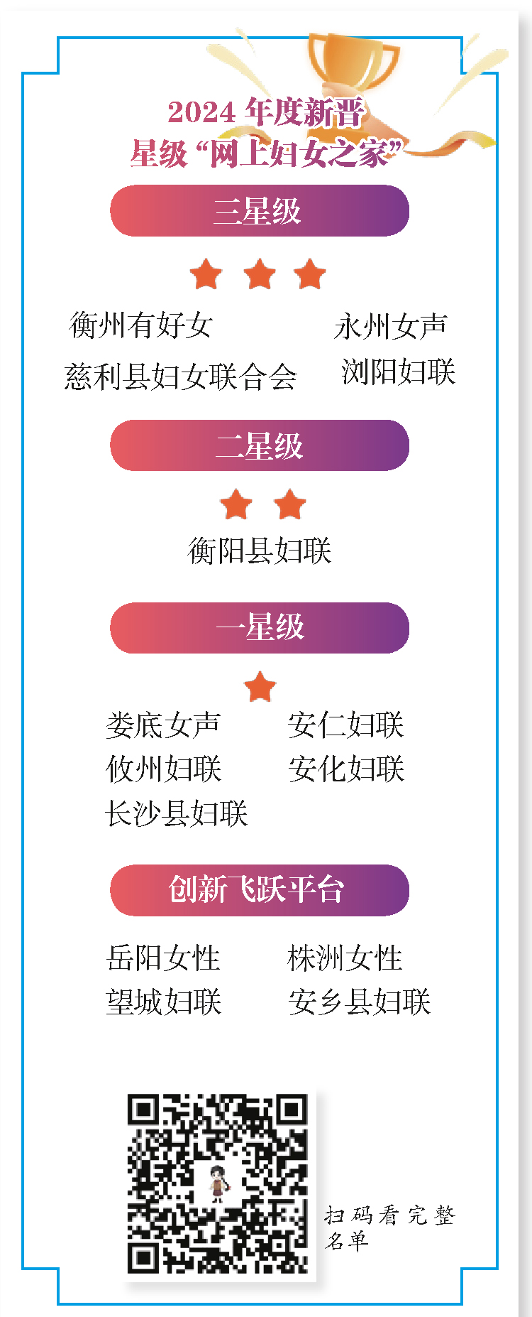 全省各级妇联结合本地实际、坚持与时俱进,一大批覆盖范围广、传播效果好、群众反响佳的网上妇联工作平台、融媒作品、网络工作案例脱颖而出。大会还发布了2024年度新晋星级网上妇女之家、湘女e家正能量融媒十佳作品等网上妇联建设表现突出单位(作品)名单,并为优秀代表颁发证书。网络大V@朱朱女侠,岳阳市妇联、娄底市妇联、衡阳市妇联、长沙市开福区妇联代表作经验分享。