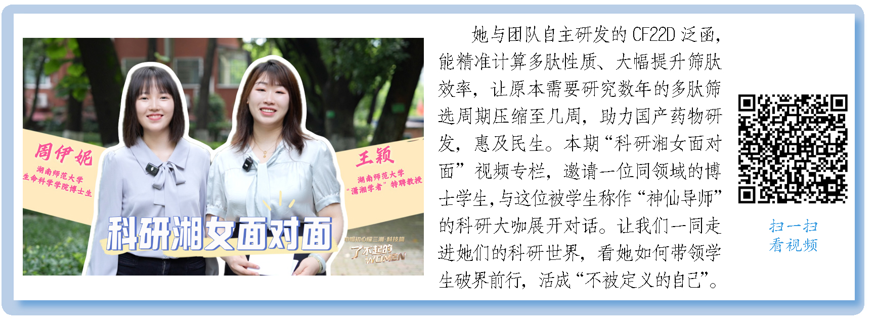正是这样开放包容的方式,让王颖与学生之间实现了“双向奔赴”。2024年,学生周伊妮攻坚“量子化学+AI多肽活性预测”这一全球鲜有先例的课题,每周组会上,师生俩都会在文献中抽丝剥茧。
