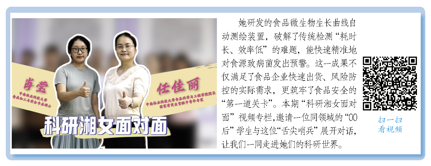 面对这些潜伏在食材中的“隐形杀手”,如何快速揪出它们?中南林业科技大学食品科学与工程学院院长任佳丽花了20多年时间专注于这件事。她研发的食品微生物生长曲线自动测绘装置,破解了传统检测“耗时长、效率低”的难题,能快速精准地对食源致病菌发出预警。这一成果不仅满足了食品企业快速出货、风险防控的实际需求,更筑牢了食品安全的“第一道关卡”。