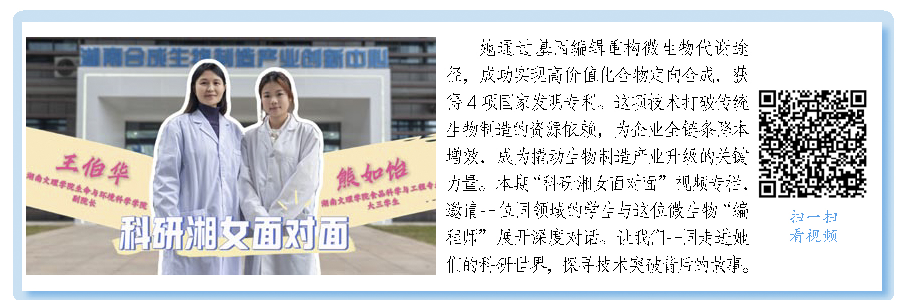 现在,湖南文理学院的实验室里,关于未来食品和创新菌种的想法正在慢慢变成现实。在王伯华的带领下,越来越多年轻人扎进合成生物学领域。“要让年轻人站在创新的最前面,把论文写在车间里、写在大地上。”王伯华说。
